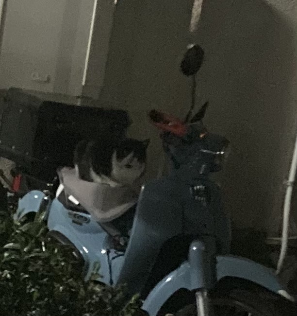 それから、車庫ではシートに枕カバーをかけて置いているのですが、今日しっかりくつろいでいる現場を目撃しました!